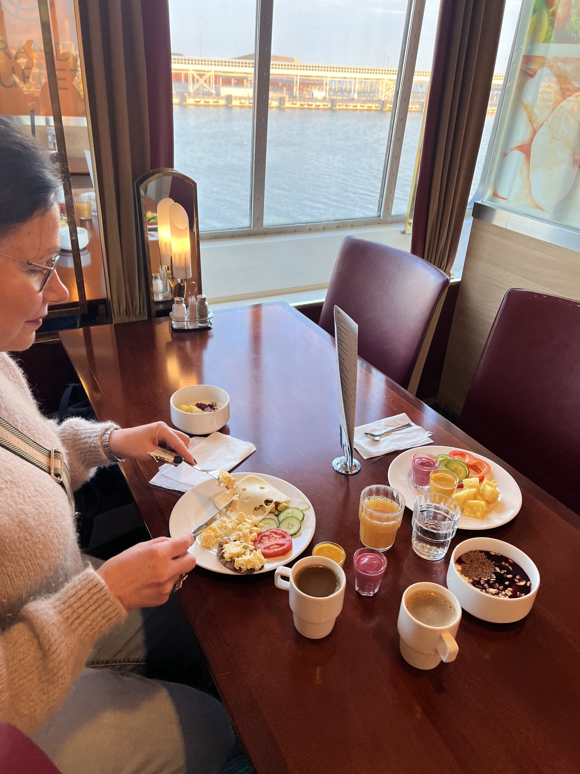 Kun saavuimme Helsingin satamaan, aloimme valmistautua matkalippujen jonotteluun terminaalissa. Yllätys oli mieluisa: Pohjolan Matkan henkilökunta jakoi jokaiselle matkustajalle hyttikortit ja matkaliput bussissa. Tässä vaiheessa matkustamisen helppous alkoi konkretisoitua toden teolla. Me saimme keskittyä yhdessäoloon ja kokemuksiin – käytännön asiat olivat pois harteiltamme.
