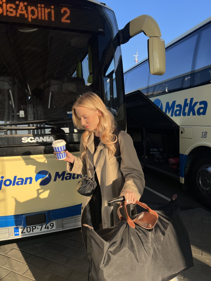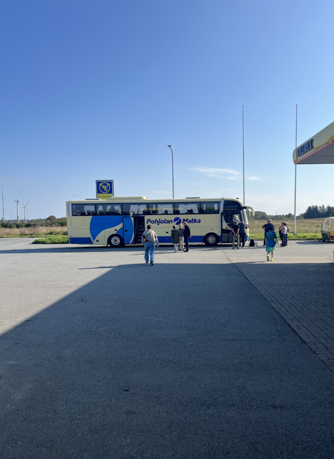 Hyppäsimme Pohjolan Matkan bussiin Kajaanin varikolta ja suuntasimme kohti Helsingin satamaa. Aamun sumun hälvetessä ehdimme pitkästä aikaa jutella rauhassa toistemme kuulumisista. Matka eteni jouhevasti ja stressitasot laskeutuivat samalla, kun ihailimme vaihtuvia maisemia. Pysähdykset sopivin väliajoin tarjosivat hetkiä jaloittelulle sekä yhteiselle aamukahville ja lounaalle.