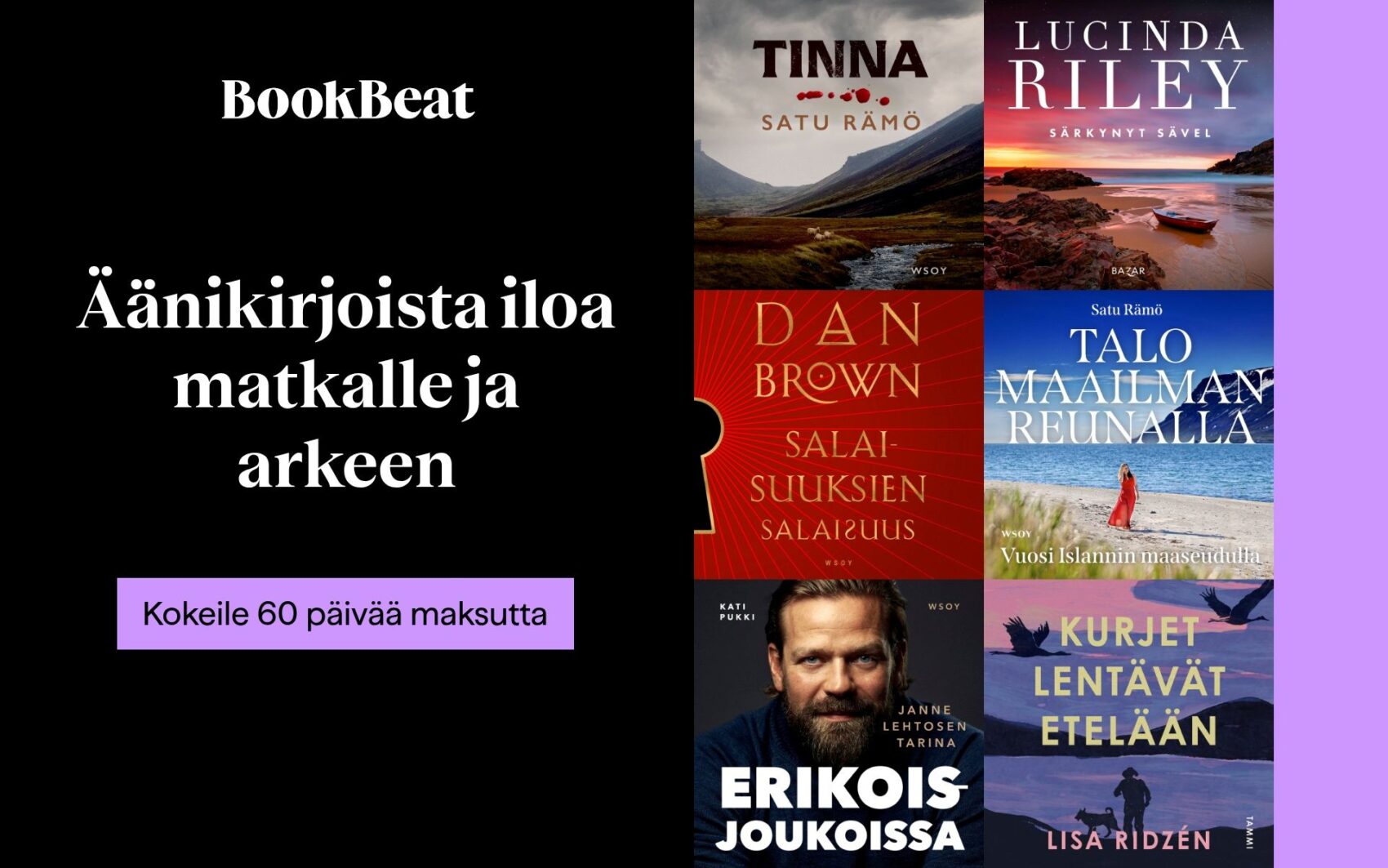 Juuri nyt sinulla on ainutlaatuinen mahdollisuus päästä kokeilemaan Suomen suosituinta e- ja äänikirjapalvelua jopa 60 päivää maksutta. Lähde seikkailulle Islannin Länsivuonoille Hildur-dekkarisarjan parissa tai tutustu yli miljoonan e- ja äänikirjan valikoimaan jännittävistä rikosromaaneista, inspiroiviin elämäkertoihin, viihdyttäviin lastenkirjoihin sekä paljon muuhun. BookBeatin äänikirjat tarjoavat täydellistä seuraa esimerkiksi automatkalla, lenkillä tai vaikkapa siivotessa ja halutessasi voit ladata kirjoja offline-tilaan, jolloin kirjojen kuunteleminen on helppoa ja vaivatonta myös ilman Internet-yhteyttä.